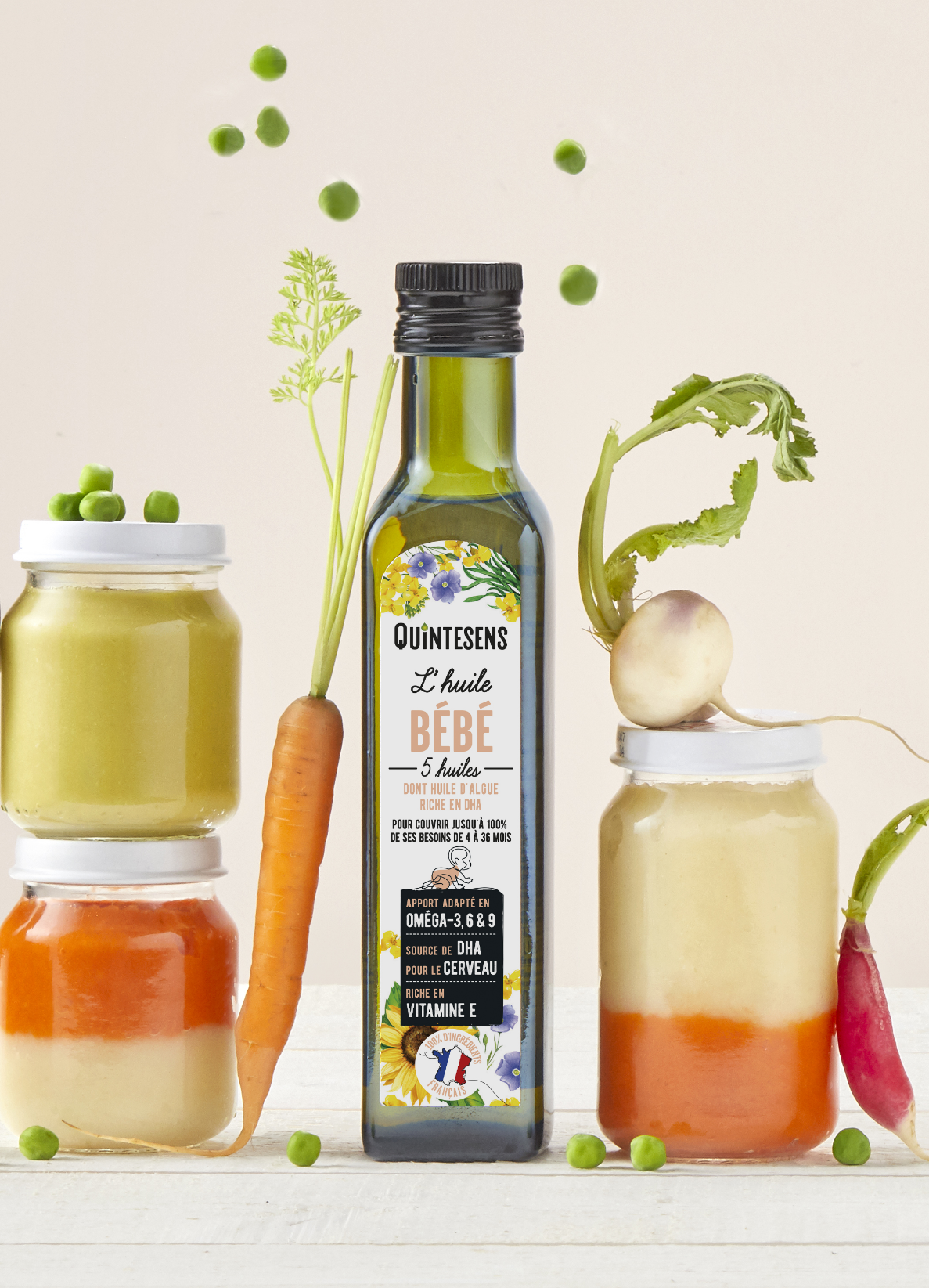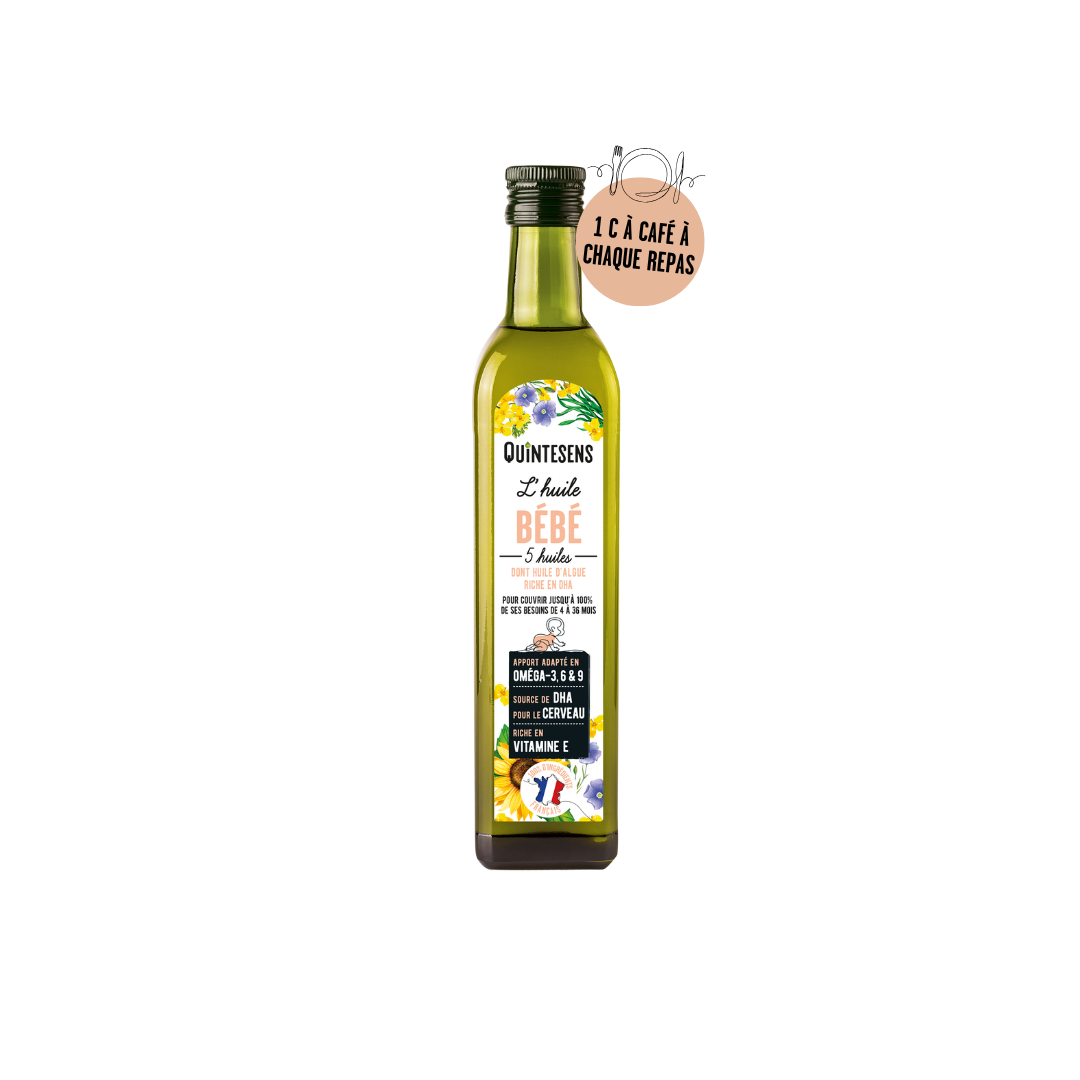Développée par des experts en nutrition, l’huile bébé Quintesens est l’huile de référence pour accompagner la diversification alimentaire de bébé. Riche en Vitamine E, Oméga-3, 6 et 9 et surtout DHA, elle apporte au quotidien à Bébé les nutriments essentiels pour le bon développement de son cerveau, de son cœur et de sa rétine tout en protégeant ces cellules du stress oxydatif. Une cuillerée dans chaque repas permet de couvrir ses besoins en acides gras essentiels et vitamine E.